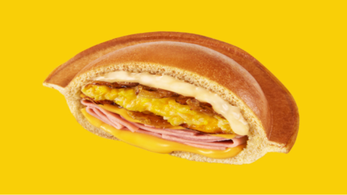 Brioche, jajecznica, cheddar, bekonez, szynka gotowana, cebula karmelizowana